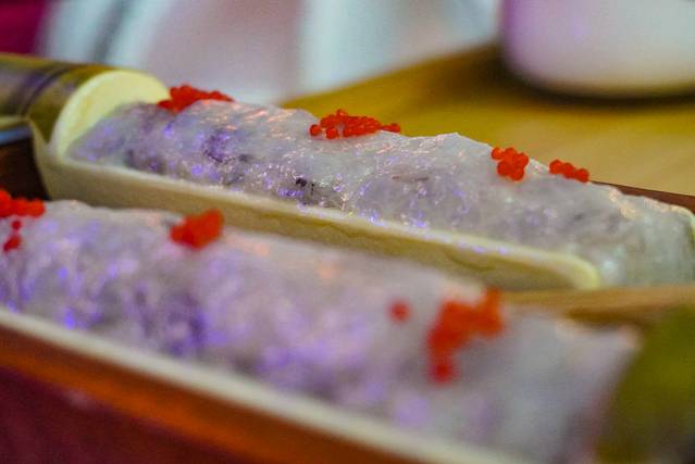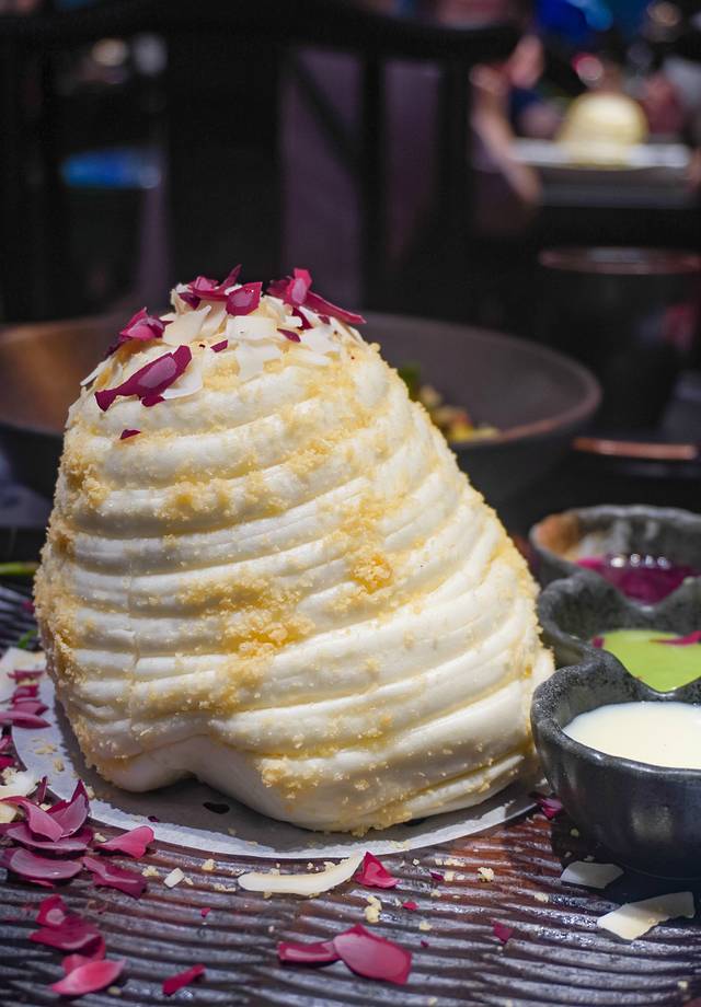 网红爆品椰香花卷:说它是网红爆品一点也不过分,特有仪式感的一道菜了。在吃之前有个互动环节很有意思,服务员会说一连串的话语,然后让我们用手轻拍干冰玫瑰花,花瓣掉落到花卷周边,特别好玩,有3种蘸料,但个人觉得蘸着炼奶吃特别香。