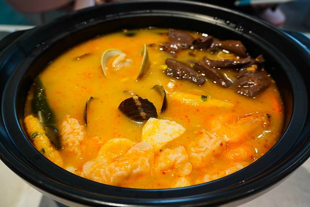 海鲜糟粕醋:这是海南很有特色的一道菜,使用本地自然发酵的米糟产生的酸醋作为底汤,加入海鲜、血旺等,吃起来酸辣可口,还有点像泰国冬阴功的味道,非常开胃。