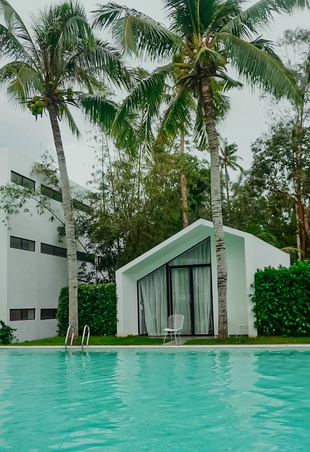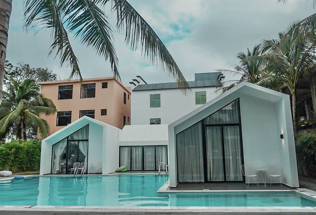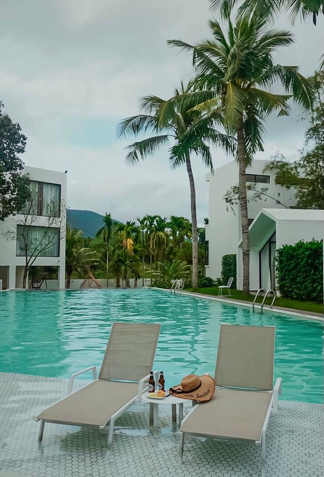 两个院子都配有游泳池,超喜欢这里的无边透明泳池了,水很清澈,而且泳池里配有各种拍照道具,很适合拍照。泳池边上还有小吧台,闲时还可以和朋友们来一杯,那可是太惬意了!
