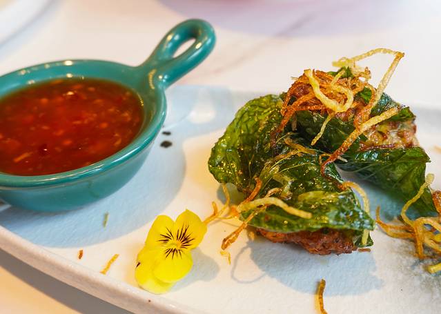 捞叶虾饼:选用海南的特色野菜包裹着香滑的虾饼,一口下去感觉都被叶子的香气包围着,口感独特,趁热吃更香味可口。