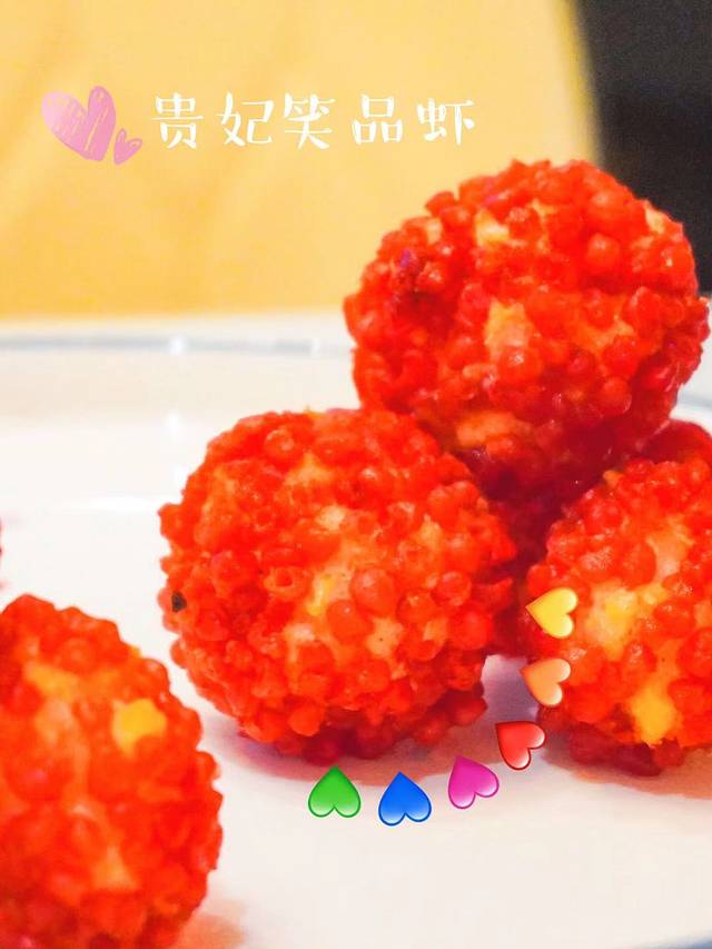贵妃笑品虾:像杨贵妃爱吃的荔枝吧,很精致的一道菜,外形像荔枝,里面是虾仁做的,一口下去,外酥里嫩,忍不住连吃几个。