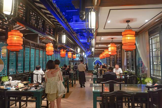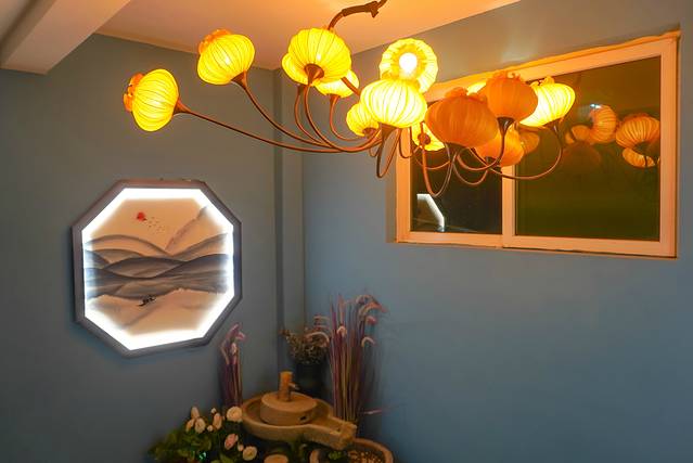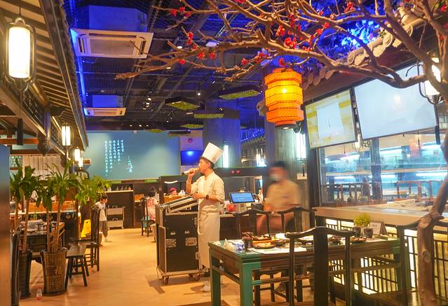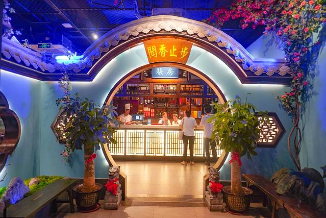 古色古香的装修风格,很有国风韵味,拱门、红灯笼、角落的绿植鲜花,就像走进一个江南庭院里。明亮开放式的厨房,让顾客用餐起来更放心。