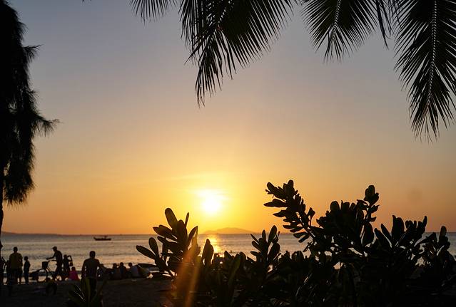 椰梦长廊也是三亚湾观看日落的最佳地方,日暮时分,当巨圆的落日在海平线展现,那一刻太阳就像一团火焰将身边的云霞都燃烧城金黄色。夕阳也把浪花打成了金黄色,是那闪闪发光的浪花啊!