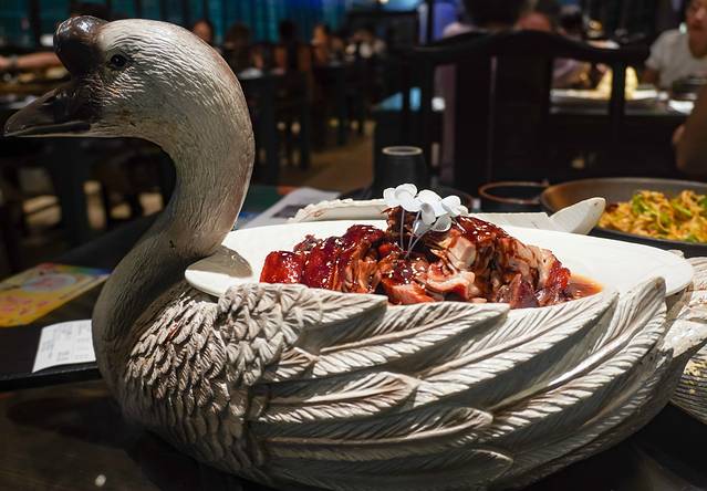 一绝酱鸭:摆盘就是一只鸭形状的盘子,很特别,摆盘精致先得人心。鸭肉口感很软,配上甜甜的酱汁,非常入味又不腻口,忍不住吃了很多块。