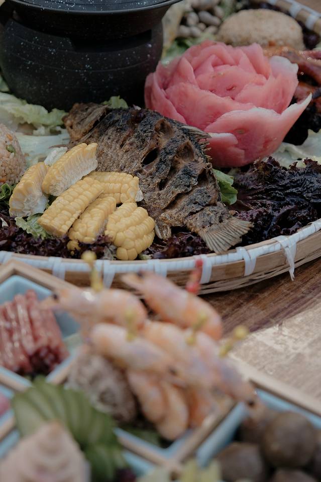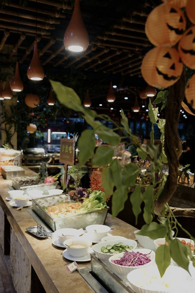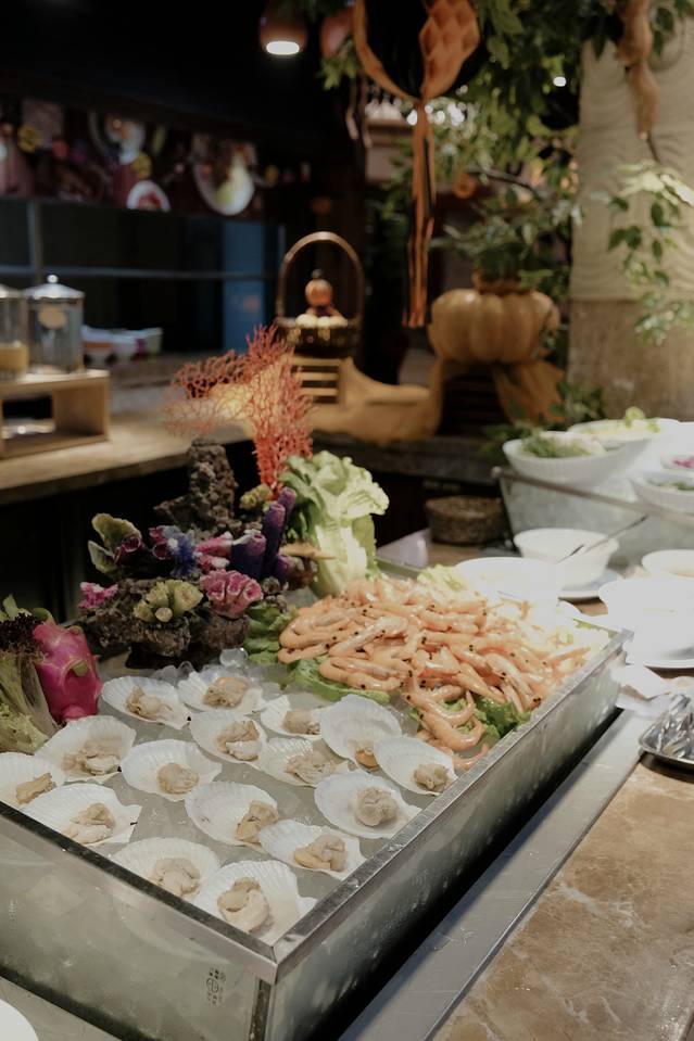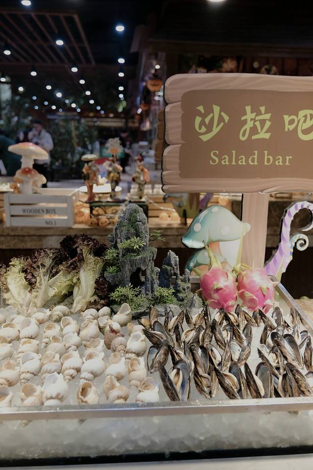 不想吃火锅?没关系。那就一起自助餐吧,熟食海鲜也算得丰盛,各种熟食、水果、蛋糕、三文鱼、炒面应有尽有,还有火锅加持。感恩节期间增加了特别演出,会和小朋友们互动,主题是教小朋友好好吃饭不挑食,生动有趣又很有教育意义,尤其适合亲子游家庭。
