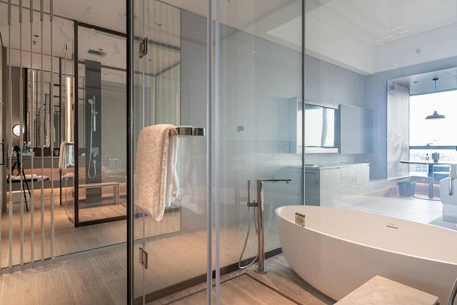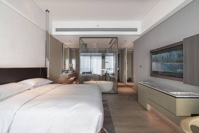 浴室是半开放式设计,使房间显得更宽敞,布局更精妙。不用担心玻璃浴室会不方便,万丽酒店的玻璃浴室采用的是安全可靠的雾化钢化玻璃,轻轻一按,就能保护好隐私,十足的高科技。更让我觉得好玩的是,为了环保,酒店不会预先准备牙刷套装,如果有需求的话,可以呼叫服务台,会在10分钟内有可爱的机器人送到门口,真是又萌又酷。