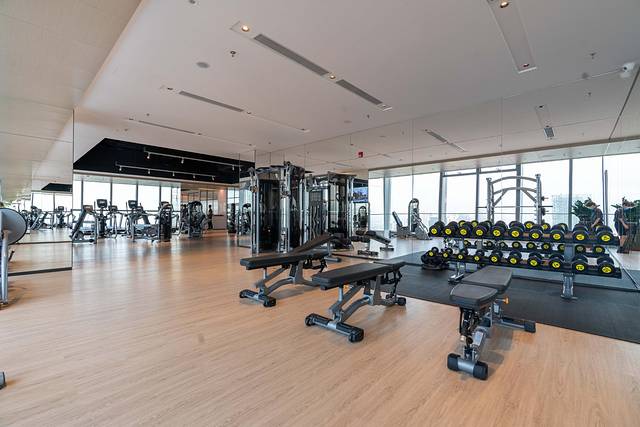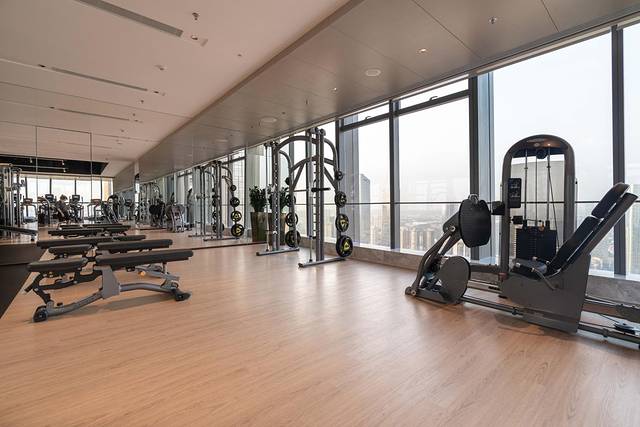 24小时开放的健身中心一定是锻炼爱好者所中意的,场地宽敞明亮,木地板干净整洁,国际顶尖水平的健身器材,还有超大面积的落地窗,都让健身成为了更愉悦的事情。