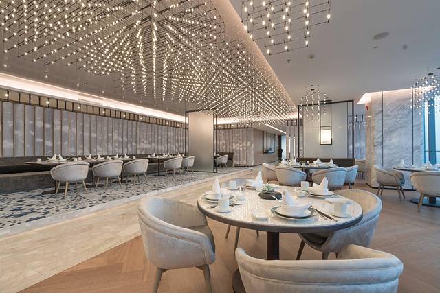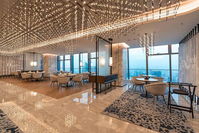 晚餐时分打卡万丽轩中餐厅,餐厅位于酒店的顶层(58层),简约大气的设计高贵典雅,如同置身云端一般,天花板上数不胜数的小灯将这里打造成了璀璨的星空, 美不胜收。