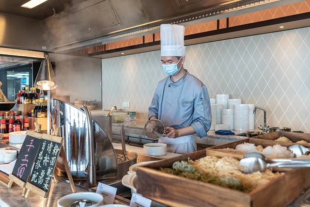 不时不食,“燃”全日餐厅遵循着这样的理念认真对待每一道菜品,即使是早餐也不含糊,厨师们现场制作美食,吃得满意放心。