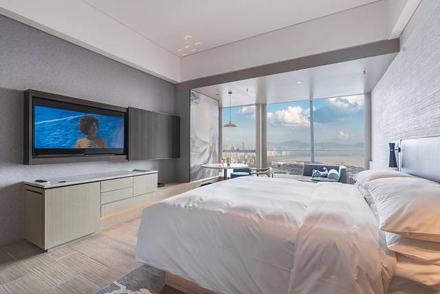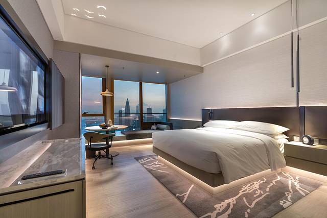 这次入住的是深圳湾万丽酒店的尊贵湾景大床房,巨大的落地窗和用心布置的灯光让室内显得通透明亮,十分惬意。