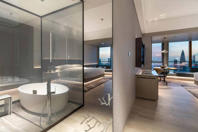 酒店位于深圳湾科技生态园的核心地段,可以尽情俯瞰深圳湾美景,而质朴的木质地板纹路又带来一丝野趣,很有意思。
