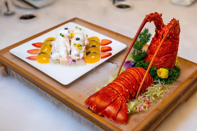 颜值最高的是鲜果青芥潮式冻龙虾,龙虾肉经过师傅巧妙的刀工一片一片地切下来,搭配新鲜蔬果,让人垂延欲滴,用餐前还有一个仪式,就是浇花上满满的“仙气”,达到色香味俱全。