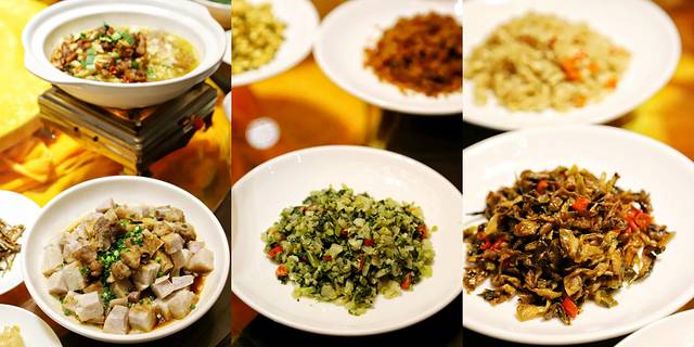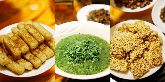 在擂茶文化里,擂茶自然是名副其实的主角儿~但是往往让客人叹为观止的是那一桌子琳琅满目、保罗万有的压桌菜!“压桌菜”,即搭配擂茶的富有地方特色的面点以及专门制作的坛子菜,传统的就有百余种不在话下,主要分为:泡菜类、糕点类、鱼类、炒货油炸类。
