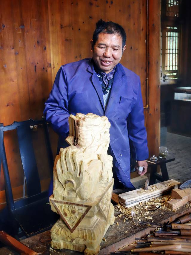 我们一进入就看到木雕师傅笑容可掬,看他的手,大概做这一行的,都没少受过伤吧!