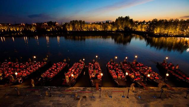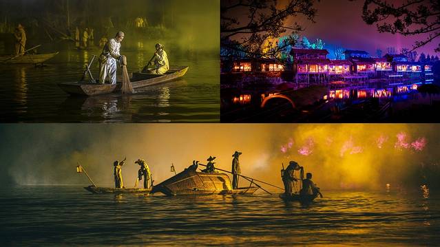 但《桃花源记》突破了这种视觉与感受的限制,客人是坐船始终处于移动状态的(算5D吗?),从五柳小镇上船,一路沿着秦溪向前挺进,两岸的表演便会徐徐展开(未到之前是漆黑一片的),全程大概1.5小时,最后到秦谷入口处完结。