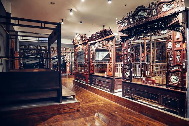 展馆内古床一字排开,雕工精美,气势恢宏,可谓蔚为壮观。