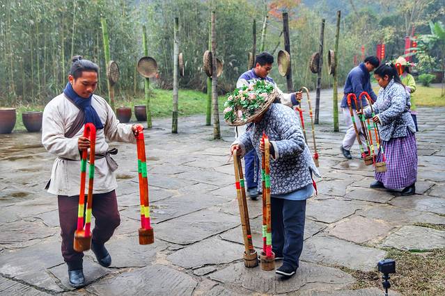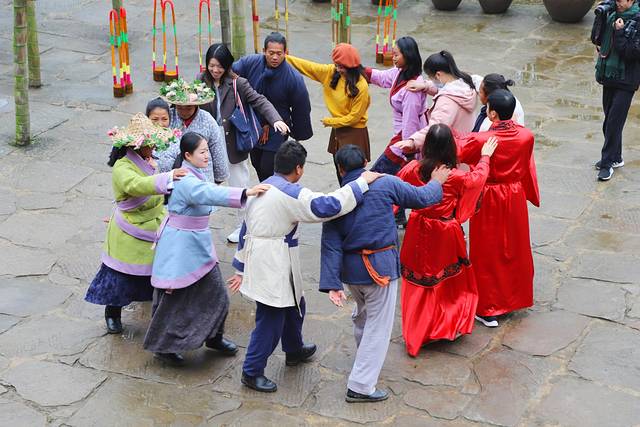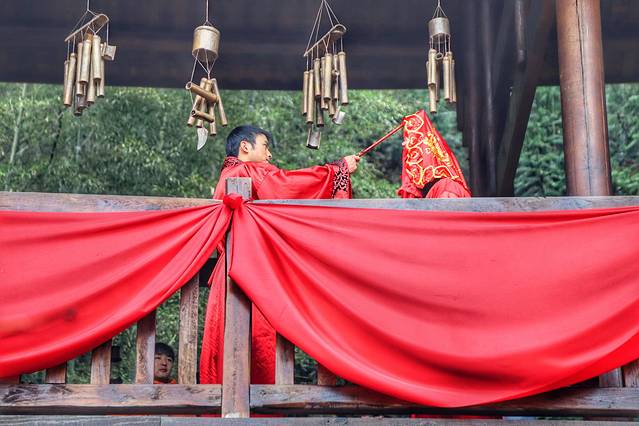 在桃花源景区里,每天于指定时间在不同的场所都会上演各种文化类表演, 比如 我们这次看的两场:一个是位于寰楼的特色婚礼以及竹篼舞,一个是位于打谷场的傩舞表演。