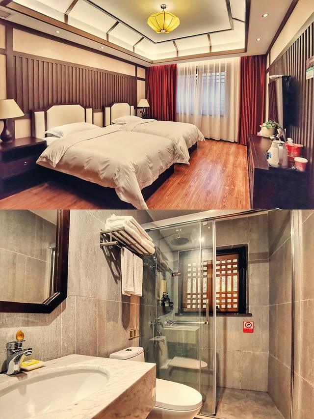房间舒适,基本洗漱用品齐全,提供烧水壶和两瓶饮用水,脱鞋提供一次性和胶拖鞋,热水给力。
