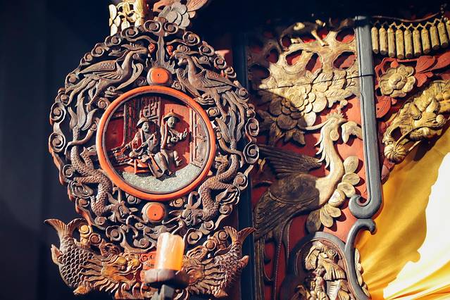 这个木雕有意思,上为凤凰,下为龙,一般来说,龙在凤凰之上,但因为清朝是慈禧掌控天下,所以凤在龙之上,“压着”龙,哈哈。