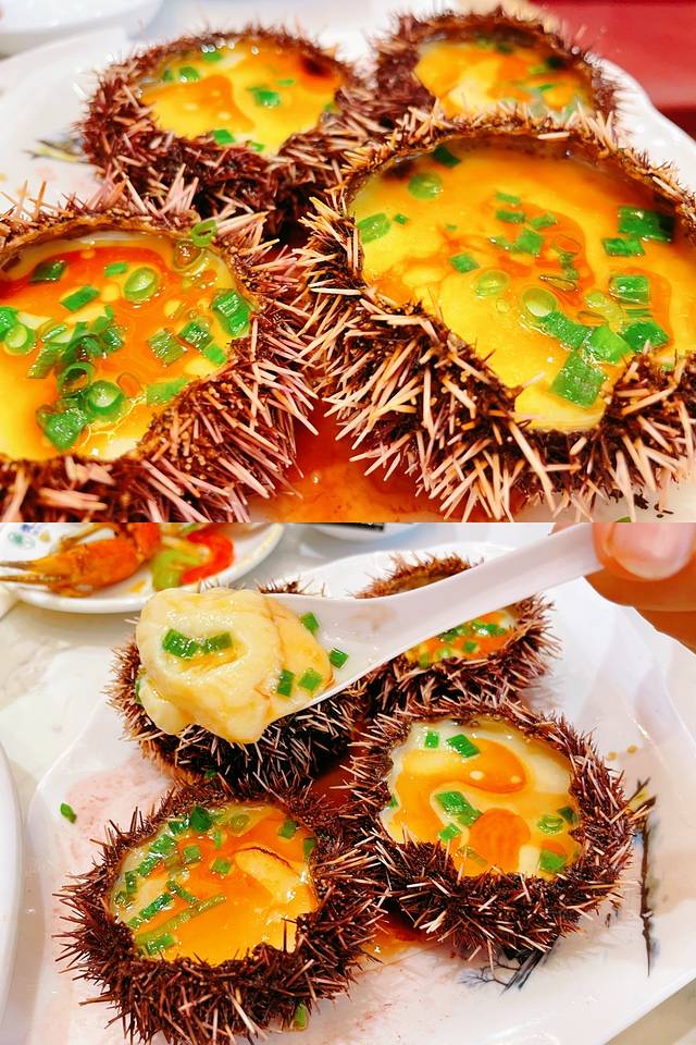 海胆蒸蛋:嫩滑的鸡蛋搭配上海胆特有的鲜味,味道很赞。豆豉味的汁浇灌一点,伴随着那股特有的香味,小朋友都可以吃这道菜,入口即化。