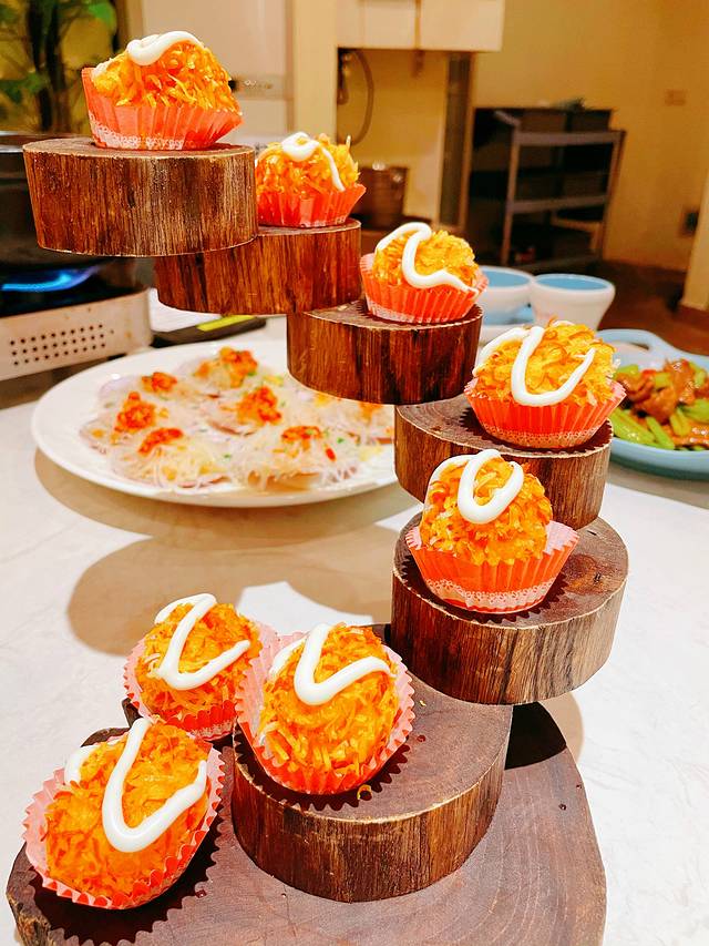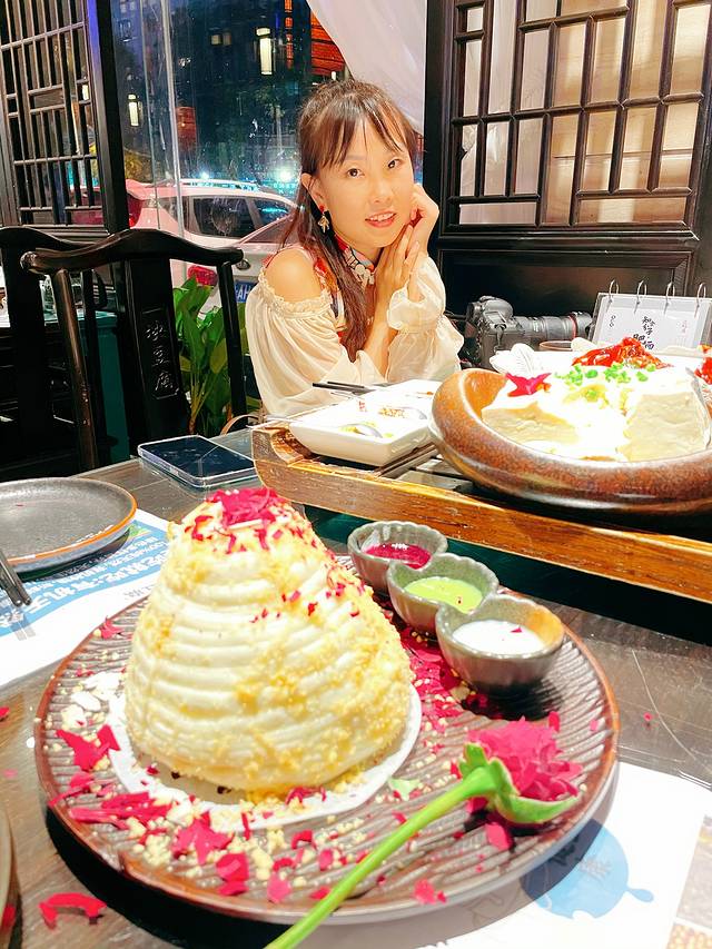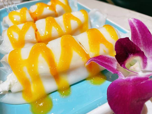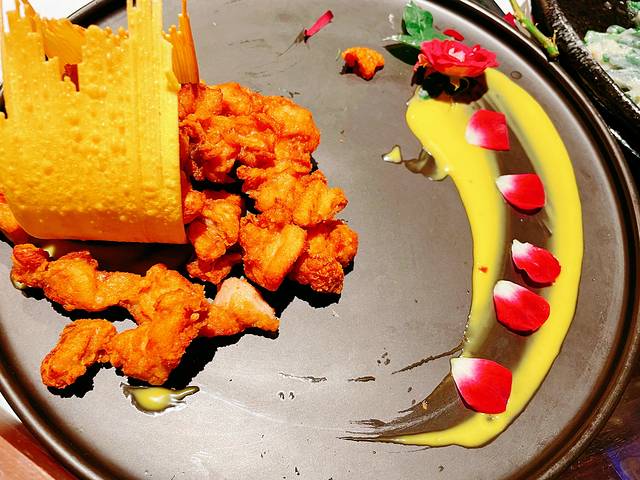 既然是网红,咱们就要好好品尝,先不说味道,黄色颜值就让我们垂涎欲滴了。而且这道菜的吃法非常具有仪式感,服务人员会先说一段这道菜的寓意,党玫瑰花瓣洒下的时候,好像就是一场盛宴。不忍心吃,哈哈,不过还是没有忍住,吃起来香香甜甜。
