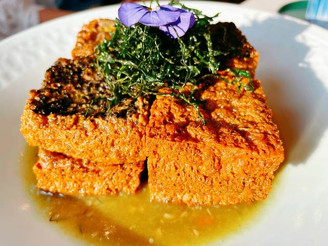 🧆自制火岩山野菜黑豆腐:这是一定要点的,黑豆腐都是现磨的,味道真的很浓,外焦里嫩,颜值也很高。