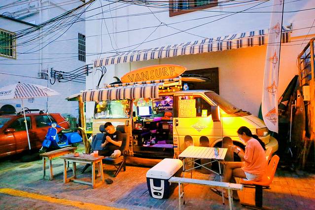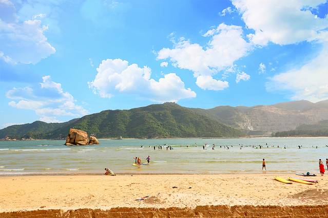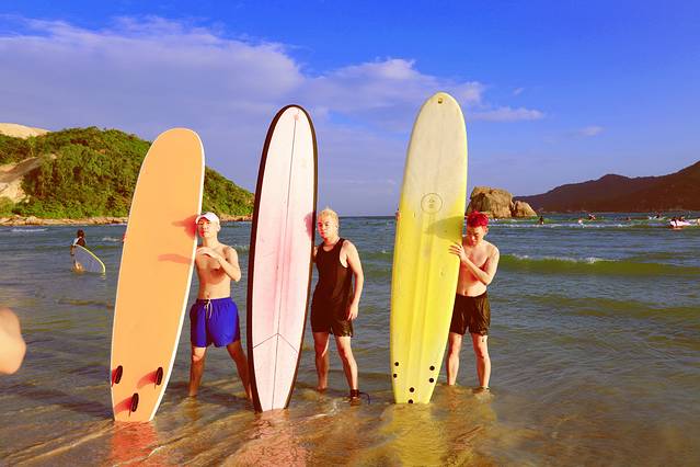 我们其中的一个朋友很喜欢冲浪,于是我们一起和工作人员聊天,发现有很多从其它城市过来,专门进行学习冲浪的。一般情况下,大概半个多小时就可以学会,至于可以到什么程度,比如是不是可以站在冲浪板上,那么就是一个熟练的问题了,需要不断的去练习。我看到很多喜欢冲浪的朋友,很帅气的在海里。最重要的是我觉得这个地方非常的东南亚,感觉很舒服。
