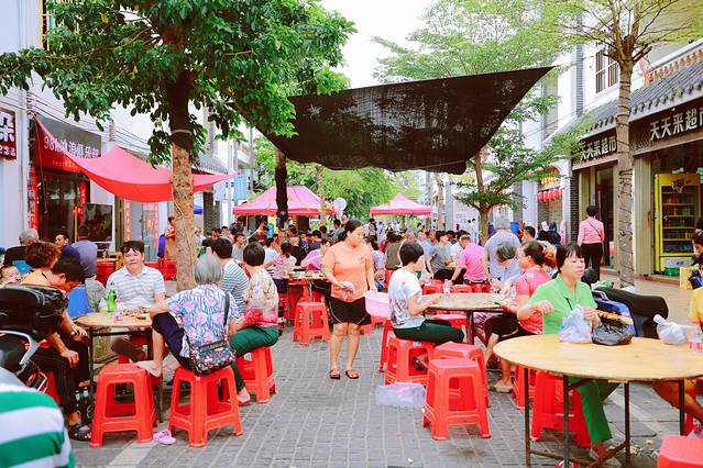 街边的摊位多了起来,好像是台北的夜市,也好像是泰国普吉岛的热闹氛围,总之,满足了一切想要的感觉。霓虹初上,热闹的氛围,叫卖的声音,如此的人文画面我很是喜欢。如果不是要赶回市区,我想我们一定会逛到很晚。各种小吃也已经上演着不同的味道,最好的是这里不允许机动车通行,安全无虞。