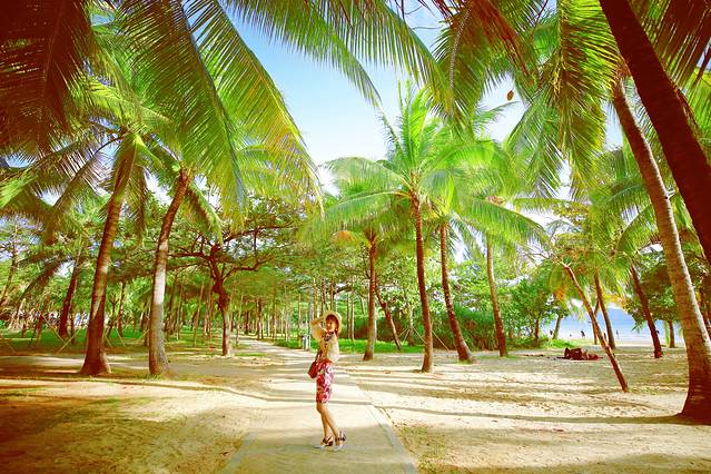 其实椰梦长廊长20公里,临海一侧为景观优美迷人的热带植物园林,与银色的沙滩、蓝色的大海相映成趣,组合成一幅色彩斑斓的长卷画图。果不其然,景色很美。椰子林就是很大的惊喜,绵延的海滩更是了。我们一下子就被椰子林吸引了,不要问我拍了多少张照片,总之我们的相机就没有休息过。