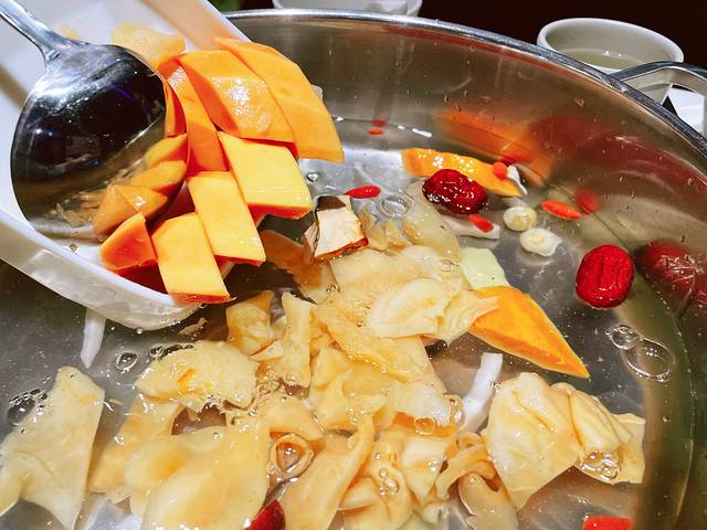 🥥花胶木瓜椰子鸡汤:实话说,椰子鸡汤一定要品尝,配合上木瓜的味道,口味俱佳。鸡肉很嫩,椰子很鲜,老少皆宜,来海南三亚,不吃椰子鸡会觉得很遗憾。