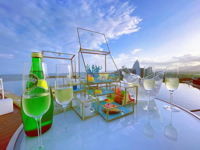 这个项目我强烈推荐,不仅仅是因为风景无限,而且下午茶的颜值太高了,口味也相当不错。蓝色的主色调,和泳池的颜色相得益彰,几个小姐妹就在这里分享彼此之间的心事和秘密,感觉棒棒哒。