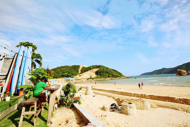 4、 后海村分为南北两个海滩,南面海湾的沙滩比较平缓、细腻,适合来这里游泳和冲浪。北部海滩有码头和礁石,那里可以玩滑翔板或坐船前往蜈支洲岛,也可以绕到海湾东面去观看日出。