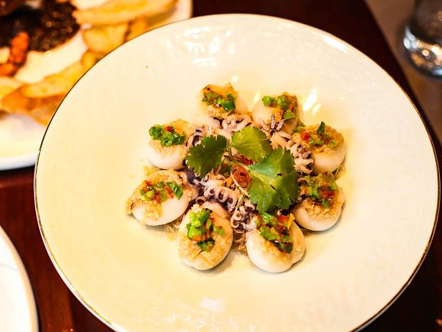 既然是一家高档餐厅,装修只是其中一个方面啦,他们家的菜品统一都很精致,我们还点了墨鱼仔,一个个小小的墨鱼仔摆成一个圆形装盘,非常弹牙。