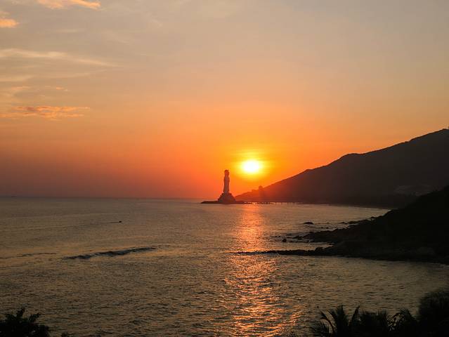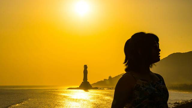 渐渐的,太阳下山了,红霞映红了半边天,也映红了半边海。南海观音在夕阳的余晖里显得更加神圣,于是我们举起相机,记录下这神圣的一刻。