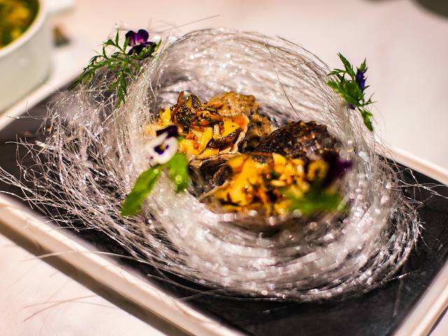 还有一道菜也有糖丝,就是拉丝米椒海螺,这是用糖丝做成了一个鸟巢的形象,然后海螺切成一片一片的,仿佛是嗷嗷待哺的小鸟宝宝放在糖丝里,海螺肉很紧实,酸辣的口感更棒。