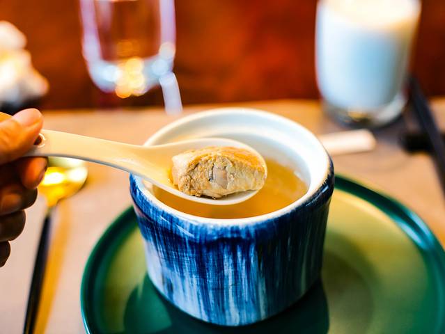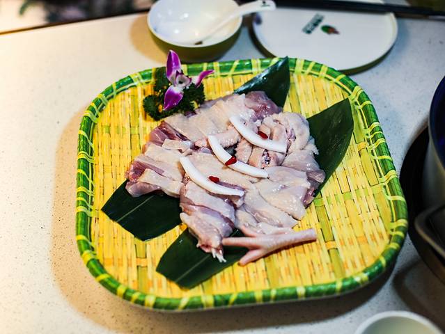 服务员把三个椰子倒入火锅中,加入新鲜的鸡肉,三分钟居然就煮熟了,不要时间太长,否则鸡肉会变老,三分钟刚刚好,再沾着服务员为我们调制的调味碗,超级享受。