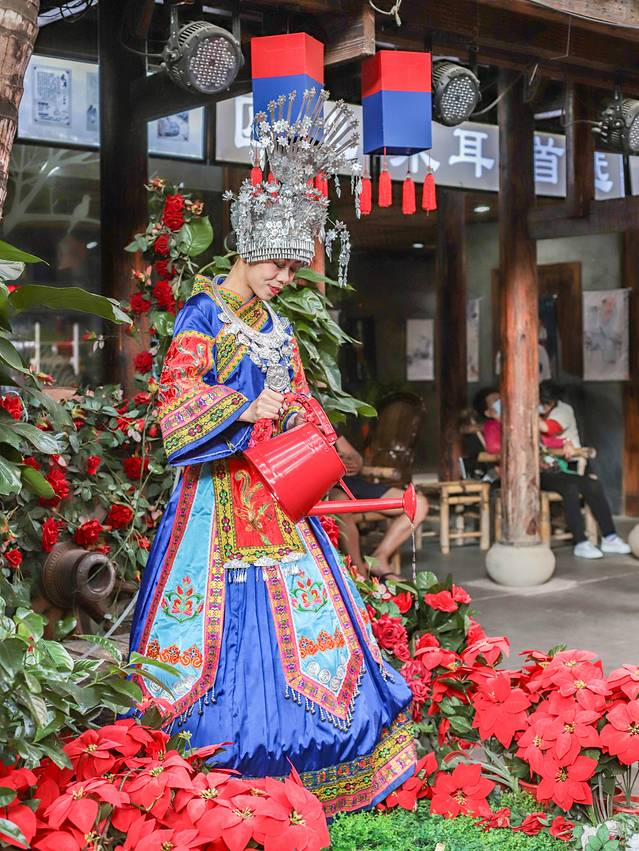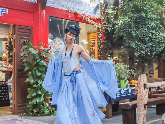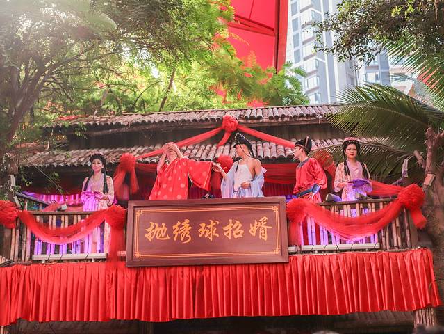 记录好就可以在园子里面游玩了,三亚千古情也不小,进来以后我们先看了一场抛绣球招亲的表演,女主角小姐姐还挺好看,她这绣球一抛,闺房底下的围观男群众都欢呼雀跃起来去争抢绣球了。得,今天的这位男主角诞生了,眼镜男斯斯文文,换上戏服,去成亲咯~