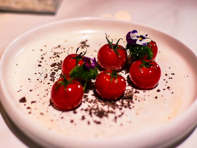 饭后甜点可以点番茄脆果沙拉,一颗一颗小小的红色小番茄,红彤彤的被端上来,装盘很时尚的感觉,迫不及待咬一口,里面居然有核桃仁,这是怎样的神仙享受,还是自己去体会吧~