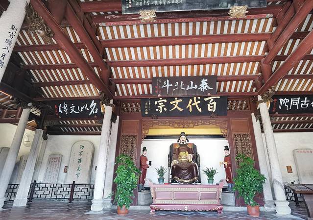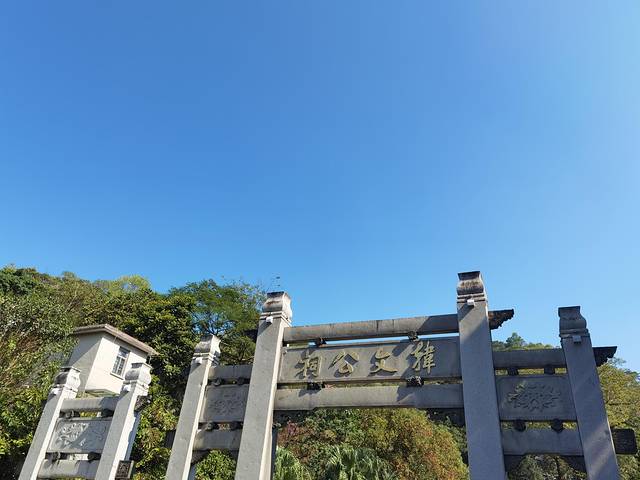韩文公祠在韩江东岸笔架山麓,建于宋。韩文公祠坊后甬道南侧是新辟建的100米碑廊,有几十幅现代政要名士歌颂韩愈而题写的碑刻。沿51级台阶的蹬道而上,便是韩文公祠主体。祠前原有一株参天橡木。如今橡木已为粗壮高大的木棉树所代替。祠面宽18.7米,进深31.8米,分前、后两进,后进比头进高2.5米。后厅居中立韩愈塑像,两旁是侍童,即传说中的张千和李万、祠侧面有允元亭,祠后登石阶面上是侍郎阁。阁前是韩愈石雕头像,阁内陈列着文物。韩文公祠现保存历代碑刻40幅,较著名的有明代的《增修韩祠之记》、《功不在禹下》和清代篆刻《传道起文》、重刻的《潮州昌黎伯韩文公庙碑》等,还有多位现代名人书写的牌匾。