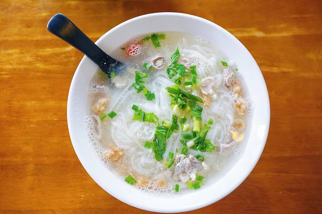 后安粉是我忍不住吃了几次,当地人叫做『粿汤』,将河粉放入滚水中快速氽烫捞出,配以新鲜的切成薄片的瘦猪肉、粉肠、大肠、猪杂、鱼饼、炸鱿鱼丝以及香菜、葱花和芹菜等配料,再倒入由猪骨、海鲜熬制的混合高汤。老板告诉我,加点海南胡椒粉更好吃