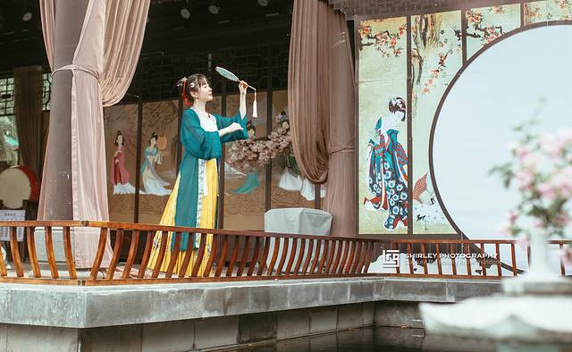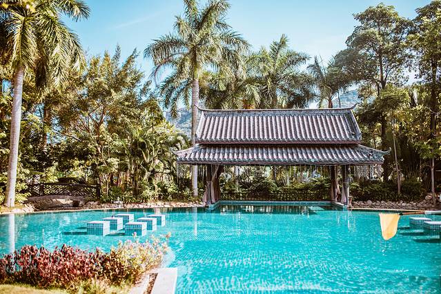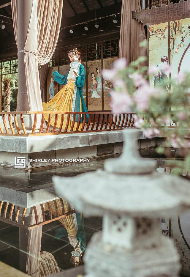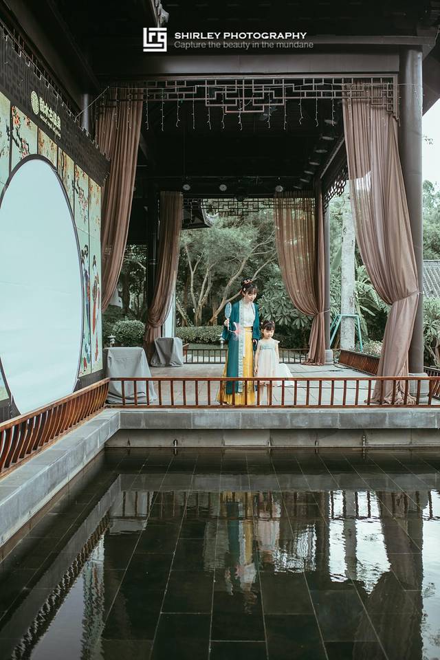 温泉区雍容华贵的中式古典风格,一花一草、一池一亭皆美景。到了晚上还有古风演出,因为特意和Suyi准备了汉服和汉元素的裙子过来拍照。就算不泡温泉,这里一步一景,也有徜徉在古典园林的感觉。飘逸的汉服和中式的温泉区特别搭,没想到酒店的温泉区也会成为古风美少女们的拍照打卡地。
