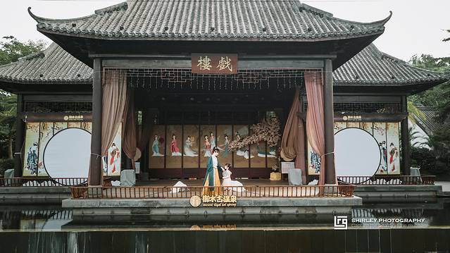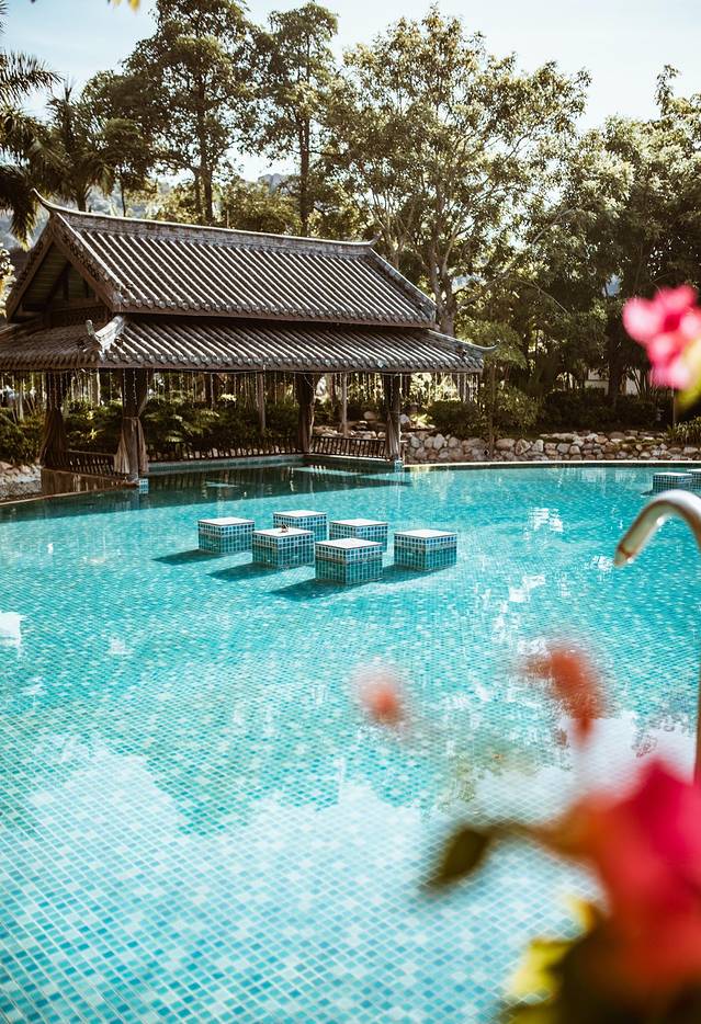 戏楼是晚上演出的舞台,下方也是一片温泉泳池。上午来泡温泉的不多,成功包场了整片舞台。戏楼被中式屏风与鲜花包围装点,暖风拂槛,雕梁画栋,仿佛随时能唱一曲《游园惊梦》。