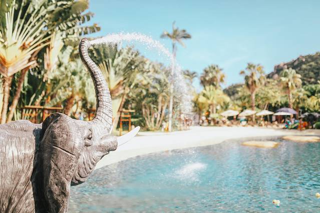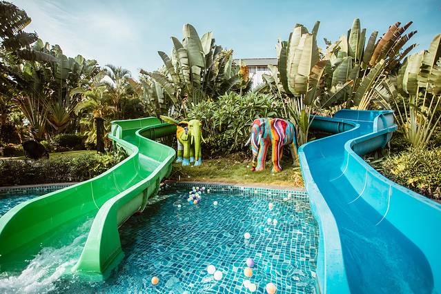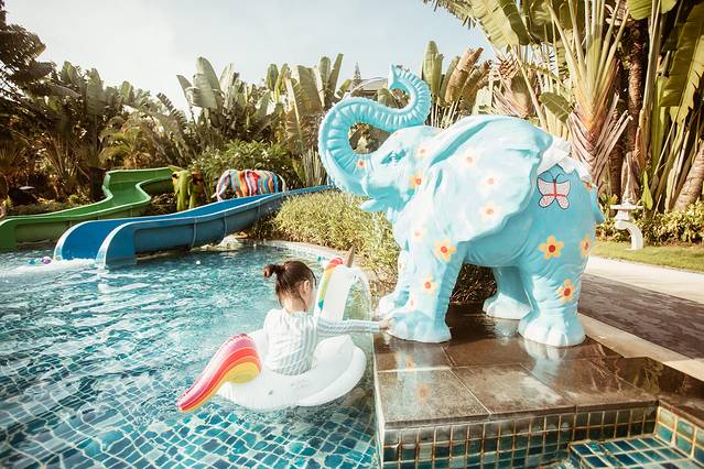 与度假村温泉区紧邻的,就是盛夏毫无悬念占C位的水上乐园——大象水乐园。温泉酒店里有水上乐园其实并不稀奇,但是像御水古温泉里这样规模的,还是第一次见,足以和三亚那些知名亲子度假村相媲美。梦幻城堡、互动水屋、 水滑梯、造浪池等多种戏水设施瞬间俘获大小朋友们的心。