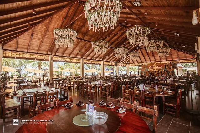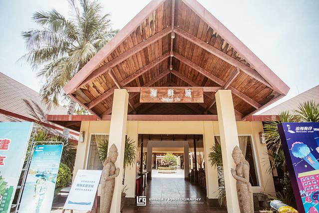 虽然海鲜城的入口不怎么起眼,但是进去后却觉得别有天地。坡式屋顶四周立柱,绿植葱茏鲜花簇拥,全敞开的格局让人觉得仿佛回到了东南亚的海边餐厅。餐厅里有两种座位,一种是在屋檐下的敞开式的大堂座位,还有能享受空调的包厢座位,大家可以根据自己的喜好选择。