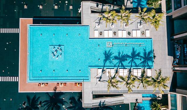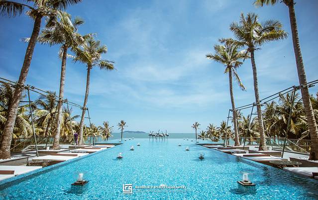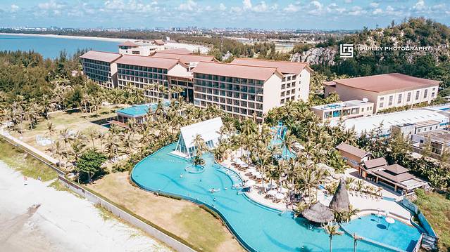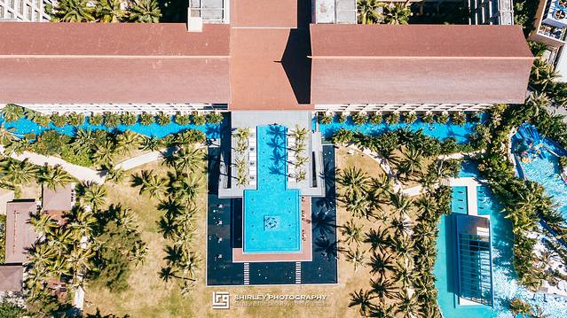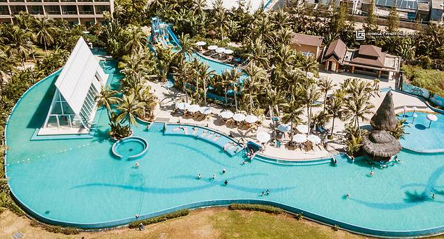 仔细观察航拍照片,你会发现,如果在海边的温德姆没有这方超大无边泳池,也会黯然失色。造型别致的无边泳池,可谓温德姆作为海景度假村之魂。