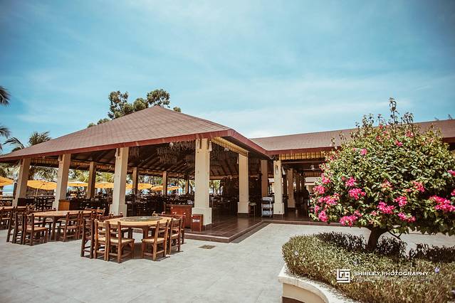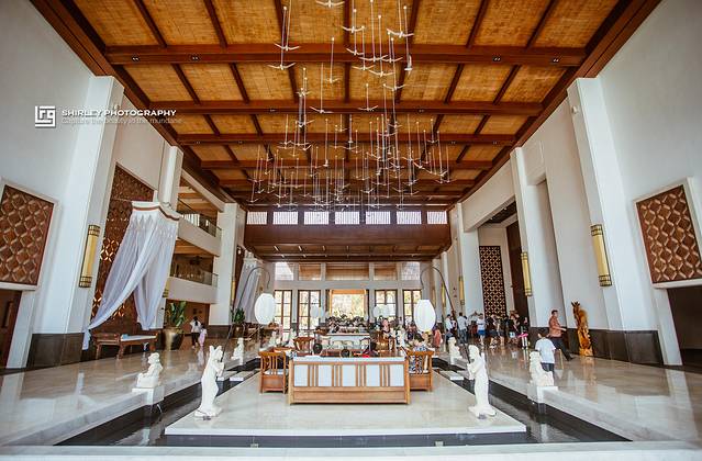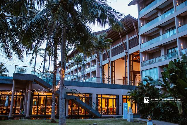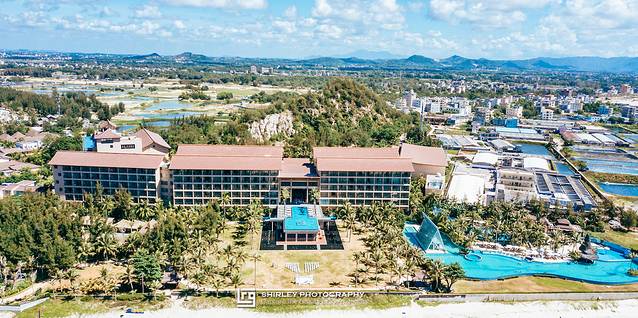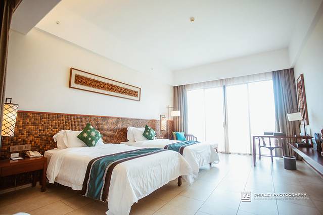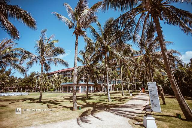 目前景区内有“浪漫海岸度假酒店”与“浪漫海岸温德姆酒店”两家酒店,我们选的是后者。温德姆酒店位于沙滩边,可以纵情地享受阳光、大海、沙滩和椰林的自然风情以及齐全奢华的配套设施。酒店由设计大师主持设计,荣获过华鼎奖酒店设计一等奖。一进入挑高联通海户外景的大堂,通透式的设计很好的利用了自然采光;东南亚风情浓郁的巨大的罗纱,正被海风轻轻抚动。