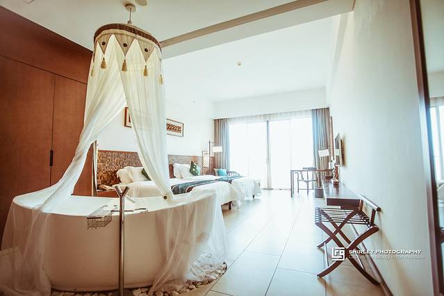 预订的海景双床房,房间大气宽敞,承袭了公共区域同样的东南亚风情。大量木质元素带来自然朴素的气息,但是设施却一应俱全,也符合温德姆的一贯高质感。海景房被布置得浪漫而富有度假氛围,特别是房间中央装饰有纱幔的浴缸;就算不使用,进屋看着就够赏心悦目了。