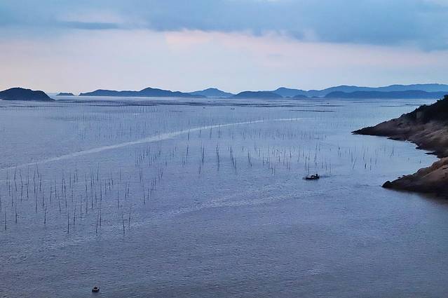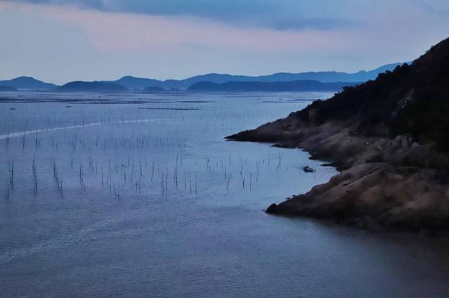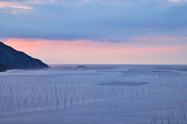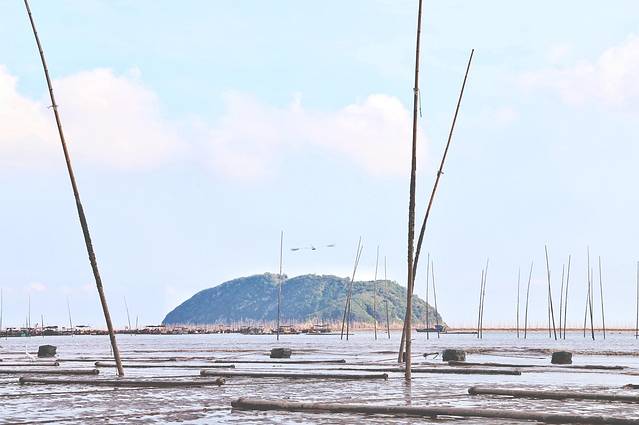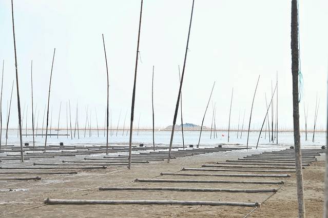 潮水涌动,滩涂上高高支起的是用来种植海带紫菜的竹竿。