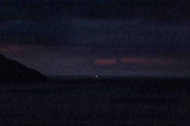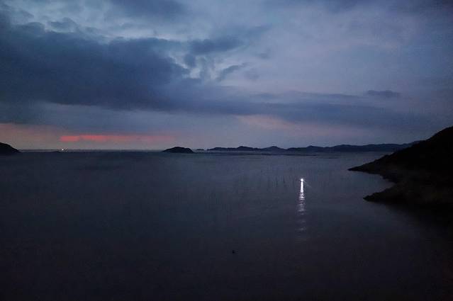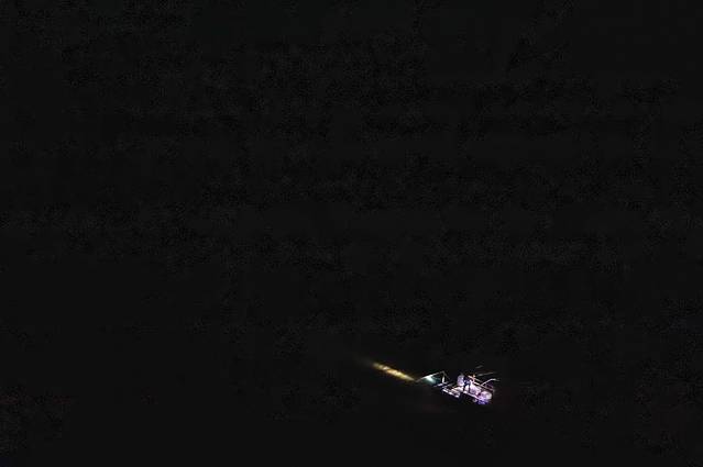沿着村子里的泥石路,走到沿山搭建的栈道上,漆黑的夜色里,看得见出海的渔船,打着束灯在前行。