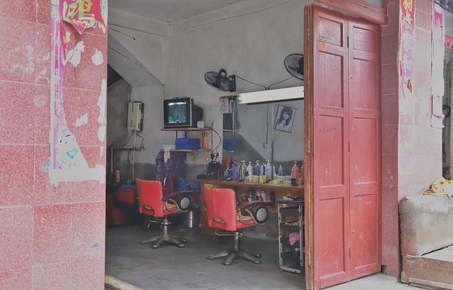 路边的理发店还保留着古早而忙碌的模样。